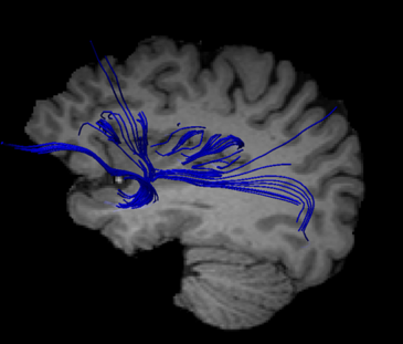 Resonancia magnética de la paciente con síndrome del acento extranjero. La flecha señala la disminución de fibras del fascículo fronto-occipital inferior a nivel de la ínsula medial, que coincide con la localización de la lesión estructural. / M. Berthier