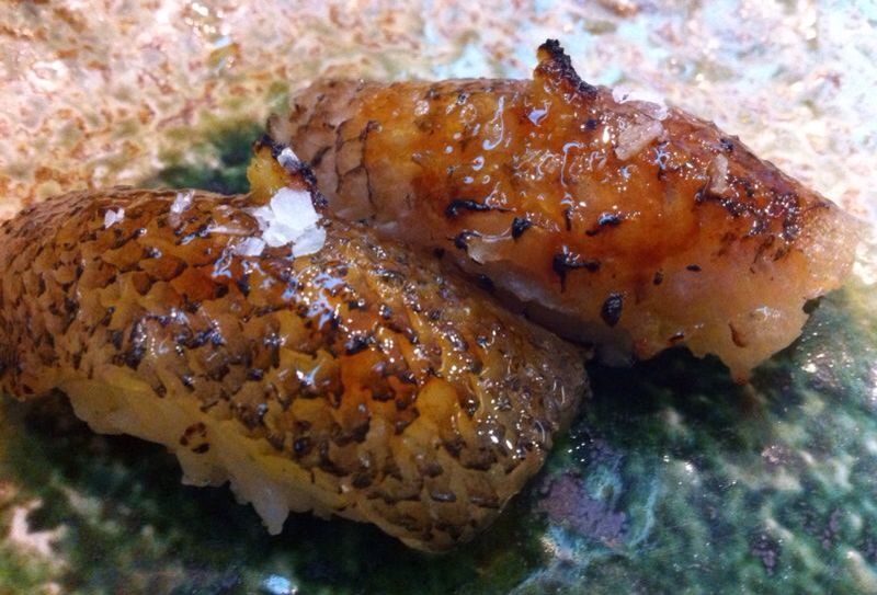 Después del aperitivo de bienvenida, con un falso nigiri de pepino encurtido y alga hijiki –crean que peculiar-, se sucedieron creaciones dignas de encomio: nigiri de cigala con galleta de su cabeza (frita con harina de garbanzos); uzusukuri de atún rojo con chip de loto y shizo; tartar de atún toro con pan de algas; sashimi de cangrejo real de Alaska “sobre hielo” y salsa ponzu; filotemaki de salmón, camarón canario y guacamole; maki de atún, picante, con huevo frito; uramaki de cangrejo de concha blanda frito (rebosado en soja), maki de erizo de Camariñas (con y sin huevo de codorniz), y un tiradito de chicharros (que da el nombre de chicharreros a los santacruceros) en su perfume que irradió su elixir marino.
