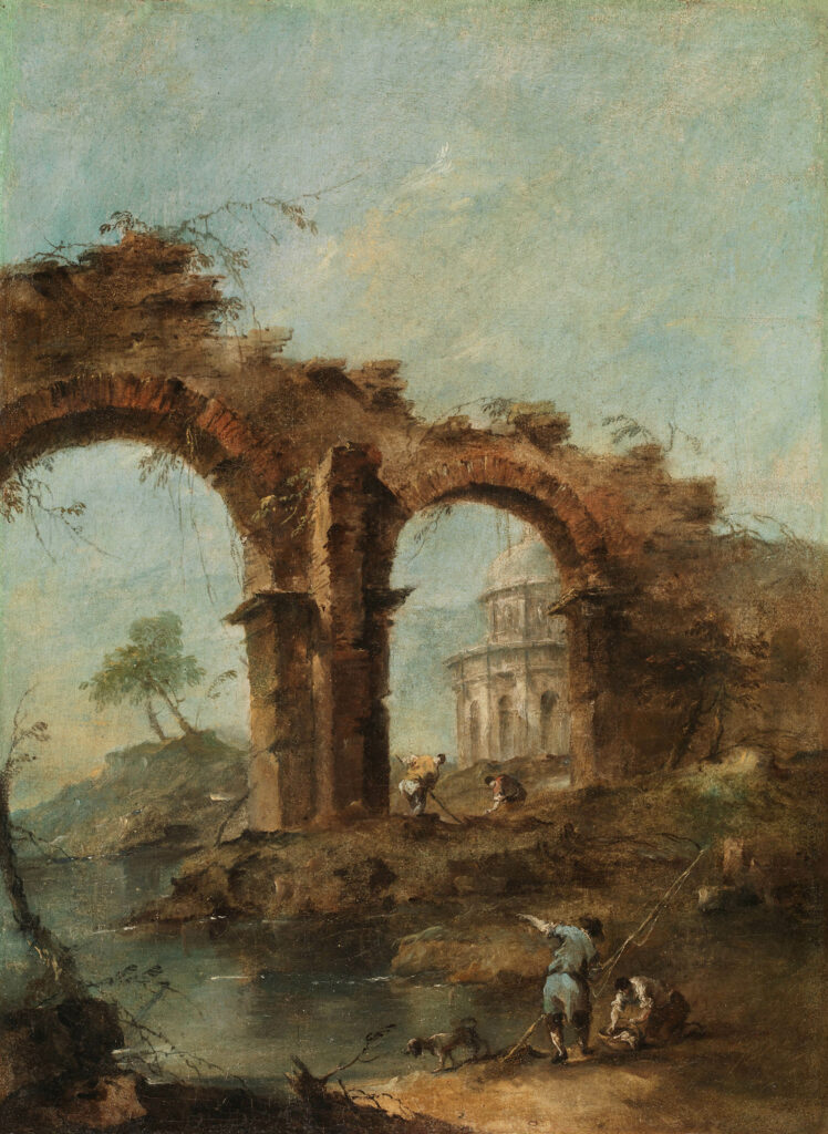 En Capricho (h. 1770-1780) puede verse a dos pescadores que se afanan en sus labores acompañados de un perro. A su lado, se expone el dibujo preparatorio de esta misma composición, Capricho con arco romano en ruinas y templo circular(h. 1770-1780), donde se pueden observar pocas variaciones respecto al resultado final. El trazo fluido, y a veces nervioso, de la pluma de Guardi, además de construir los espacios, tiene la facultad de reflejar lo que será la carga de color posterior del pincel.