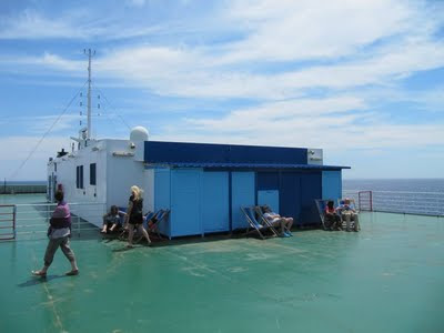 Después de acomodarnos en el camarote de 4 personas fuimos a cubierta para ver la partida del puerto. estamos a 23 de junio y no estaría de más una chaquetilla para el airecito que se levanta en cuanto se mueve el barco.