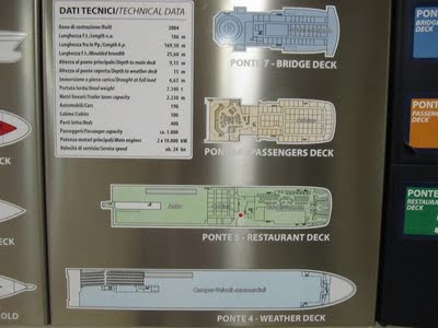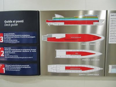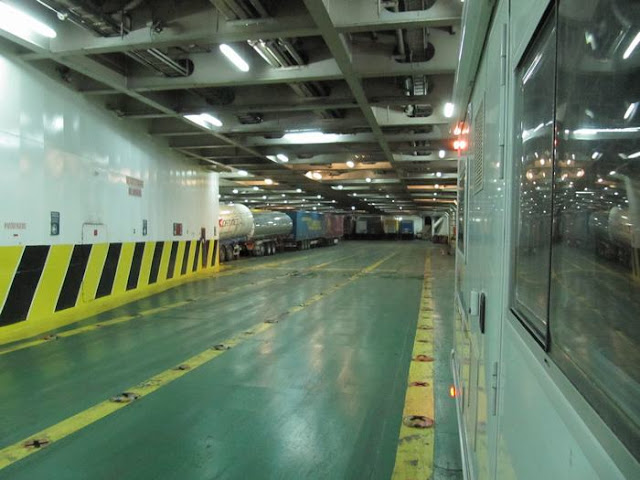 Son las 22:00 horas, hemos llegado perfectamente a la hora indicada, dos horas antes de la partida como aconseja la compañía naviera. el proceso hasta el embarque nos lleva una hora y cuarto, dejando la autocaravana en el tercer piso del buque (en realidad el que está casi en línea de tierra).