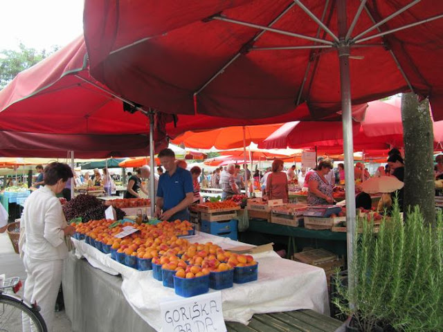 mercado al aire libre de frutas y verduras, que está ubicado en la plaza Vodnik. Nos perdemos un rato en este tranquilo mercado, nadie grita ni se jacta de sus productos, tú deambulas y si te agrada la pinta de alguna fruta te paras y la compras. Tranquilo como Ljubljana.