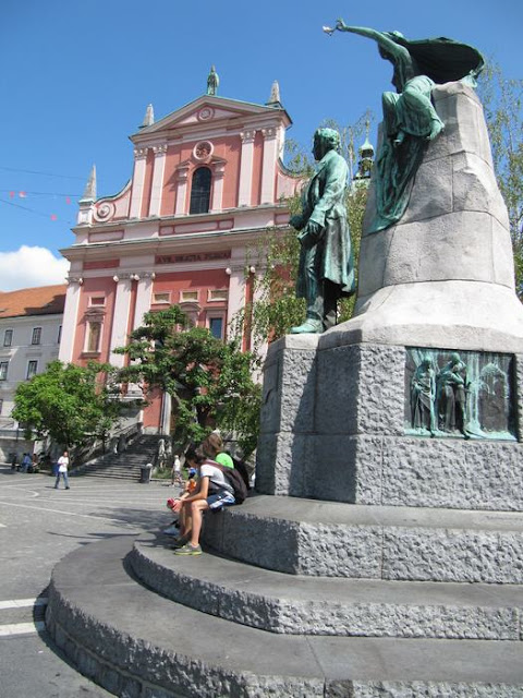 Bajamos cerca del centro y nos acercamos hasta la plaza principal, llamada Prešeren o Prešernov. Esta plaza debe su nombre al más grande poeta esloveno, France Prešeren (1800-1849). Uno de sus poemas «Zdravljica / Brindis» llegó a ser el himno nacional. Y por eso se alza en la plaza