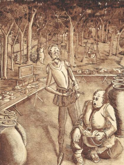 Lo primero que vio el buen Sancho, glotón sí; pero no tan desfavorecido como los que hay ahora, según cuenta el autor fue: “…espetado en un asador de un olmo entero, un entero novillo; y en el fuego donde se había de asar ardía un mediano monte de leña, y seis ollas que alrededor de la hoguera estaban no se habían hecho en la común turquesa de las demás ollas, porque eran seis medias tinajas, que cada una cabía un rastro de carne: así embebían y encerraban en sí carneros enteros, sin echarse de ver, como si fueran palominos; las liebres ya sin pellejo y las gallinas sin pluma que estaban colgadas por los árboles para sepultarlas en las ollas no tenían número; los pájaros y caza de diversos géneros eran infinitos, colgados de los árboles para que el aire los enfriase.”