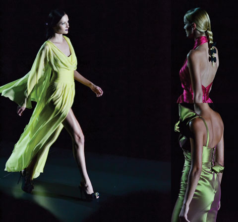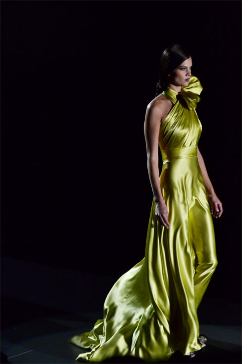 Ese fue el tono elegido por Hannibal Laguna para empezar su desfile con vestidos vaporosos en unas primeras salidas que fueron el previo del movimiento del satén al caminar y poco a poco fueron adquiriendo volumen. Limas, fucsias y negros tiñeron una colección muy Laguna que dejó ver también algún que otro tornasolado.