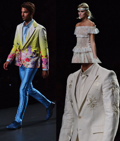 Las flores, estampado clásico de la primavera, no sólo estuvo presente en este desfile. Victorio&Lucchino en un alarde de fusión ( que recuerda a primaveras pasadas de otras pasarelas) mezcla flores con motivos orientales. Haciendo un guiño al mercado asiático. Mucho colorido, conjunto de texturas y menos volantes de lo habitual que acaban lo que empieza un cuelo mao.