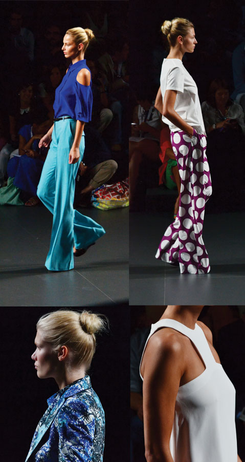 Toca el turno de Angel Schlesser en donde prima la sencillez y elegancia de unas piezas de cortes limpios. Apuesta como Verino por unos hombros al descubierto en blusas y vestidos camiseros. Predominan el fucsia, los azules, y como no, el blanco y el negro. Surgen pantalones de pata ancha que no dejan ver el zapato. Una colección de la que te lo llevarías casi todo, una colección con propósito de venta con muchas adeptas.