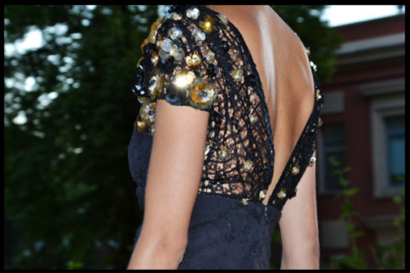 Poco a poco se fue dando paso a los delicados encajes que se iban convirtiendo en exquisitas mallas con pedrería y flores de metal. Haciendo uso de su combinación fetiche: Negro y oro.