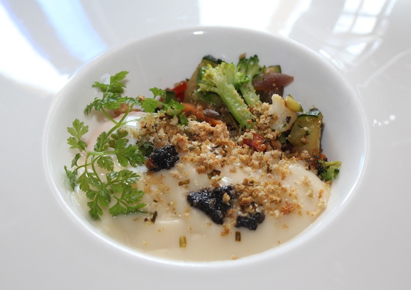 Huevo a baja temperatura con crema de patata, coliflor y trufa acompañado de verduritas de temporada y pan de pimiento rojo.
