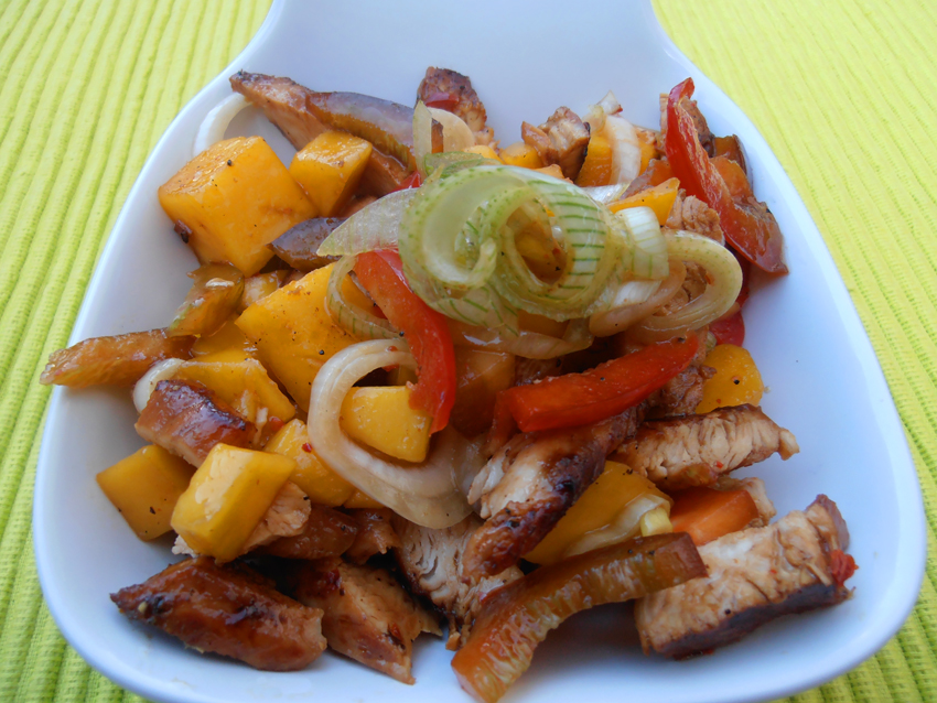 Pelamos y cortamos el mango y lo añadimos todo a la salsa.