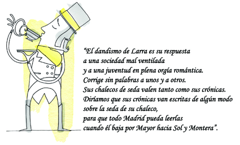 Marina: La mayor fuente de inspiración fueron los textos, cuya riqueza narrativa funcionó a la perfección como motor generador de imágenes. Me sentí especialmente cómoda con el Larra dandi de Umbral (que es, por múltiples motivos, mi preferido). En un intento de emulación, intenté paliar a golpe de lapiceros y bonitismo el desasosiego del Agosto madrileño. Además, mis dandis emplean el afeitado con patilla como nexo narrativo porque las patillas son francamente importantes en mi existencia.