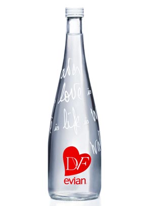 Uno de ellos adorna la nueva botella edición limitada de evian: “Water is Life is Love is Life is Water”, escrito con la inconfundible caligrafía de Diane von Furstenberg. El lanzamiento está previsto para el próximo mes de noviembre, fecha en que se pondrá a la venta en todo el mundo a un precio que rondará los 3 euros por botella.