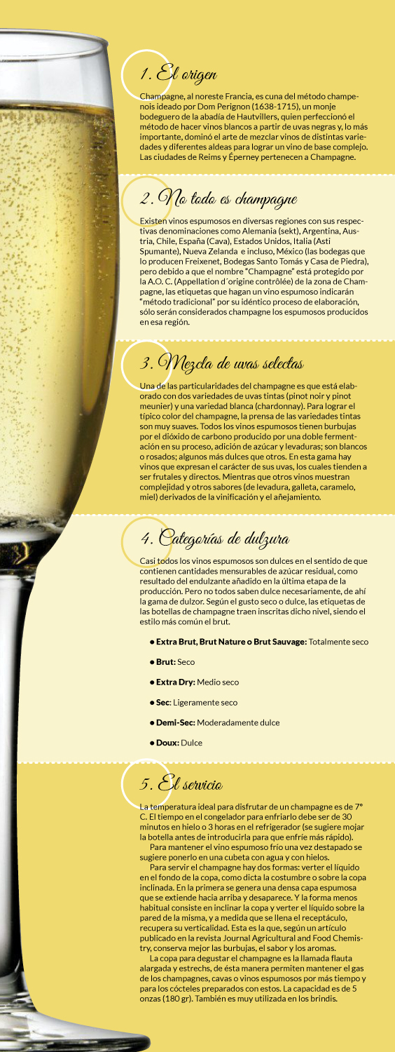 Sin duda en toda celebración hay un vino espumoso, y el festejo sabe aún mejor cuando la botella proviene de la región Champagne, Francia. Es esta la época de mayor consumo de este vino, y qué mejor que hacerlo con algunos elementos que nos puedan ayudar a disfrutarlo más.