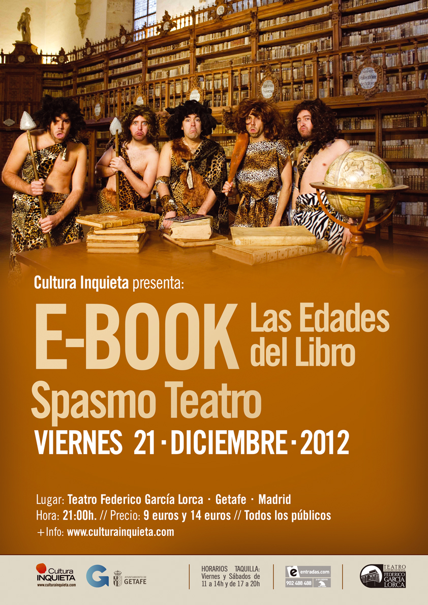 Las pinturas del hombre de las cavernas, los pergaminos de Egipto, la aparición de la imprenta con Gutenberg o el trabajo de los monjes copistas… Así hasta llegar al actual eBook, el libro electrónico. La Plataforma Cultura Inquieta acerca al Teatro García Lorca de Getafe la historia del libro y sus protagonistas contada por Spasmo Teatro a través de su humor gestual, su ironía y sus efectos visuales y sonoros. Se trata de la obra que con el título de eBook y el subtítulo de Las edades del libro ha recibido este año el Premio del público al mejor espectáculo en el festival Domingos do Principal (Pontevedra). En Getafe, el eBook inquieto se representará el viernes, 21 de diciembre, a las 21.00 horas.