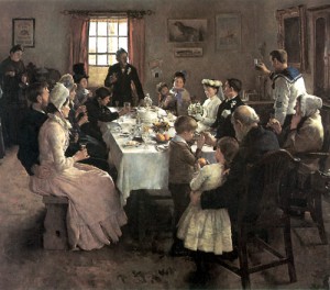 Stanhope Alexander Forbes (1857-1947), «Brindis de boda». El cuadro sintetiza admirablemente el espíritu del brindis, dentro de una modesta ambientación, con unos pocos invitados de familia, entre los cuales se levanta el joven marino que, disfrutando quizás de un permiso, brinda al final del convite por la felicidad de la hermana recién casada.