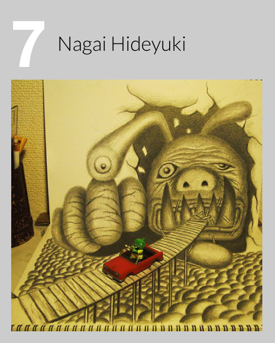 Como el artista chileno Fredo, de 21 años de edad, el artista japonés Hideyuki Nagai sabe cómo hacer que las ilustraciones cobren vida. Con el uso de un simple bloc de papel como telón de fondo, el artista crea increíbles ilusiones ópticas en 3D utilizando carbón y lápiz. Su trabajo anamórfico debe ser visto desde un cierto ángulo para que las imágenes parezcan salirse de la página. Realmente impresionante.
