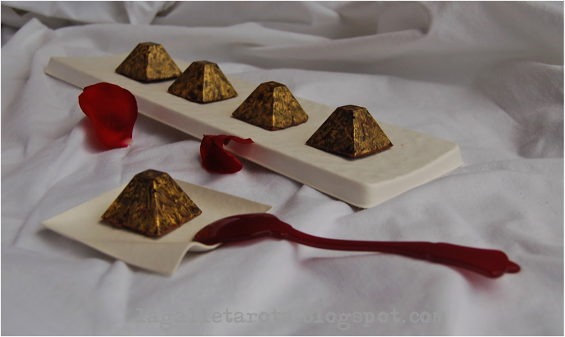 – Después de pintar (como ya os he dicho antes) los moldes con colorante dorado y forrar con chocolate negro, calentar la nata y fundir en ella el chocolate con leche. Dejar templar.