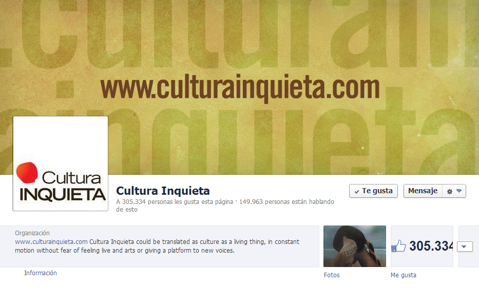 Cultura Inquieta ha comenzado el año con un registro de más de 300.000 seguidores en Facebook, una cifra que sirve para consolidar esta red social de la plataforma como la más potente de España en el ámbito cultural y una de las más seguidas de Europa. No obstante, para Juan Yuste, director de Cultura Inquieta, más allá de los números lo importante es la comunidad internacional y el foro de debate que se está construyendo en torno al arte y la cultura. Constantemente, Cultura Inquieta publica en sus redes sociales imágenes e información sobre el trabajo de infinidad de artistas de la escena nacional e internacional.