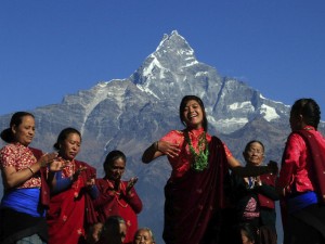 NPL06 DHAMPUS (NEPAL) 30/12/2011.- Varias mujeres indígenas nepalesas de la comunidad Gurung vestidas con su traje tradicional bailan durante una ceremonia de Año Nuevo típica de su pueblo, con el Monte Machapuchre al fondo, en la localidad de Dhampus, a unos 250 kilómetros de Katmandú (Nepal) hoy, viernes 30 de diciembre de 2011. La mayoría de los jóvenes de este pueblo sirven actualmente a las órdenes del ejército británico así que las mujeres de esta comunidad celebran la llegada del nuevo año sin sus seres queridos. El grupo étnico Gurung cuenta con una población de 700.000 individuos que viven en los valles montañosos nepalíes, lo que supone el tres por ciento de la población total del país. EFE/Narandra Shrestha