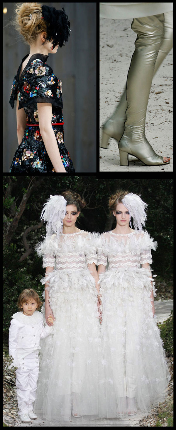 Tras la propuesta de la esperada Dior, lo que dió de sí la semana de la Alta Costura parisina pasó por un Chanel que siempre crea expectación pero más por ambiente que por prenda. La característica lana brillaba de día y los hombros marcados, se mezclaron con plumas y el estampado florido, tan presente durante la semana. Modelos con aire melancólico deambuleaban por el bosque que se había creado como escenario. «No hay nada más elegante que un cierto tipo de melancolía» declara Lagerfeld. La ausencia de belleza en sus zapatos empieza a ser un sello del diseñador que cerró el desfile con dos novias y su ahijado como protesta a la polémica sobre los matrimonios homosexuales que se vive en Francia.