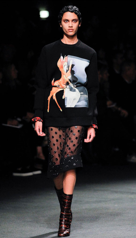 Y llegó Tisci y un show para Givenchy que se abría paso con » Your my sister « con Antony Hegarty de Antony and the Johnsons, amigo del diseñador, que acompañó el desfile con tres canciones. Una colección que declara que ha sido de las más divertidas de su carrera, jugando a su manera con recuerdos personales. Mostró siluetas peplum, tocó tejidos como el cuero y pieles, sin restar importancia a los detalles. Y morimos por esas sudaderas que combinan con faldas transparentes adornadas. Ocho años en la casa, revisando siempre los archivos de Givenchy y su fuerza continúa de una manera personal y totalmetente creativa.
