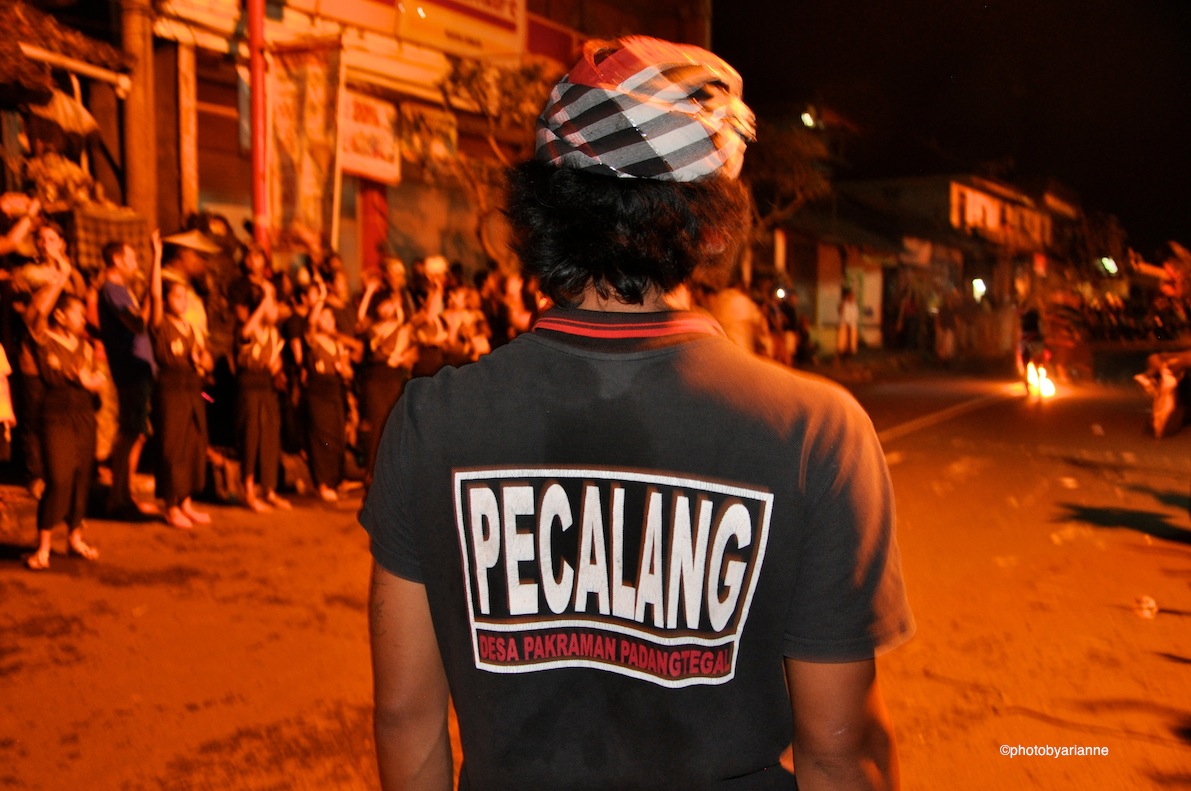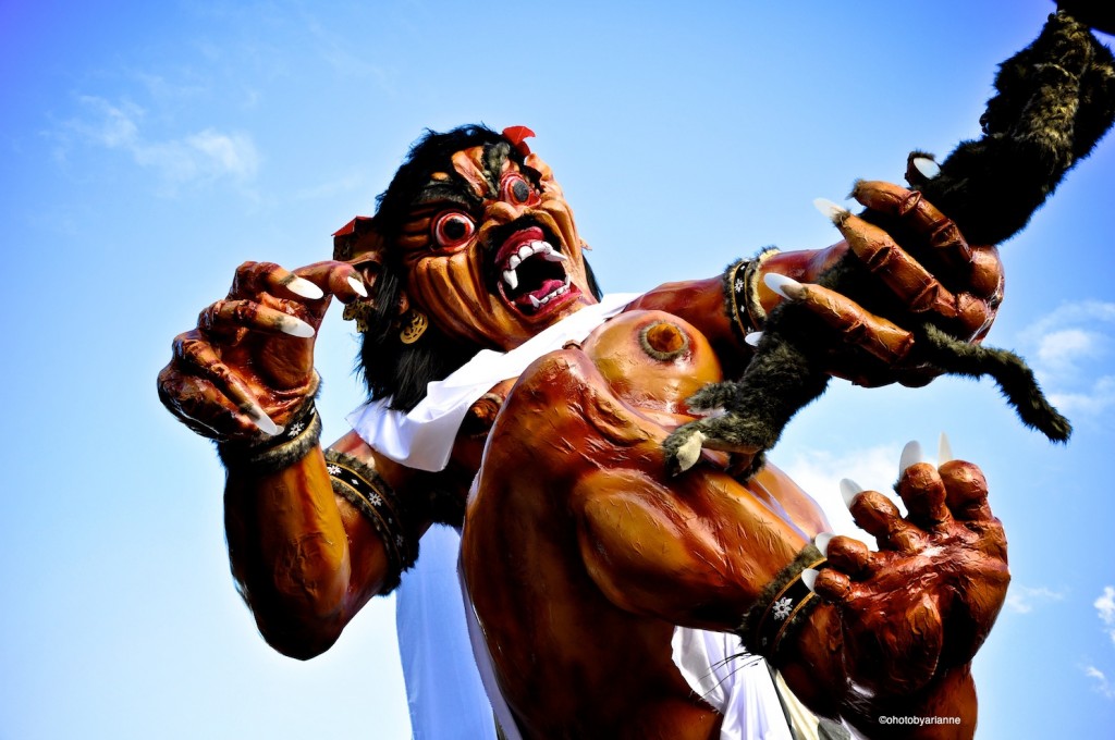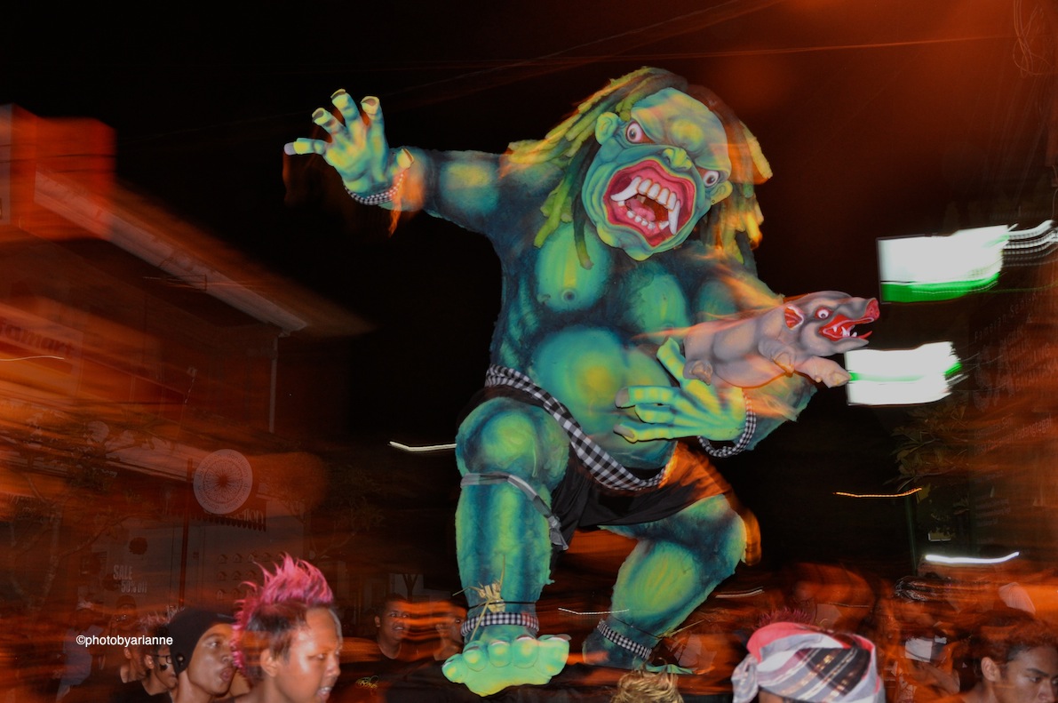 Desde hace más de un mes todas las villas en Bali se preparan la ocasión. Pequeños y grandes construyen monstruos gigantescos de papel maché y bambú, algo parecido a nuestros “ninots”… Simbolizan a los malos espíritus, así que cuanto más terrorífico su aspecto mejor. La mañana del 11 de marzo todas las villas harán despliegue de sus enormes monstruos, para el deleite de vecinos, transeúntes y visitantes… y al atardecer es hora de sacarlos a bailar. Son los Ogoh-ogoh. Al estilo de una procesión de semana santa, los grupos de cada villa se visten de gala y pasean a sus monstruos por todas las calles, haciéndolos bailar y moverse al ritmo de la música del gamelan. El objetivo es hacer el mayor ruido posible, hay que atraer a todos los demonios. Esta noche se celebra que se acerca el final del año y también el final del mal,… simbolizado con la quema de los monstruos al final de la noche, al más puro estilo fallero. Todo esto ocurre la víspera de fin de año…