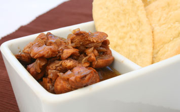 Cortamos la pechuga y la cebolla a tiras. Freímos la cebolla en un poco de aceite hasta que esté dorada. Retiramos la cebolla de la sartén y añadimos en la misma sartén la pechuga y la freimos.