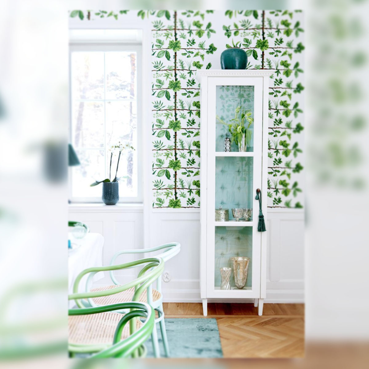 Nos hemos enamorado especialmente del degradado en verde de las sillas de influencia Thonet y del papel pintado del diseñador Pierre Frey.