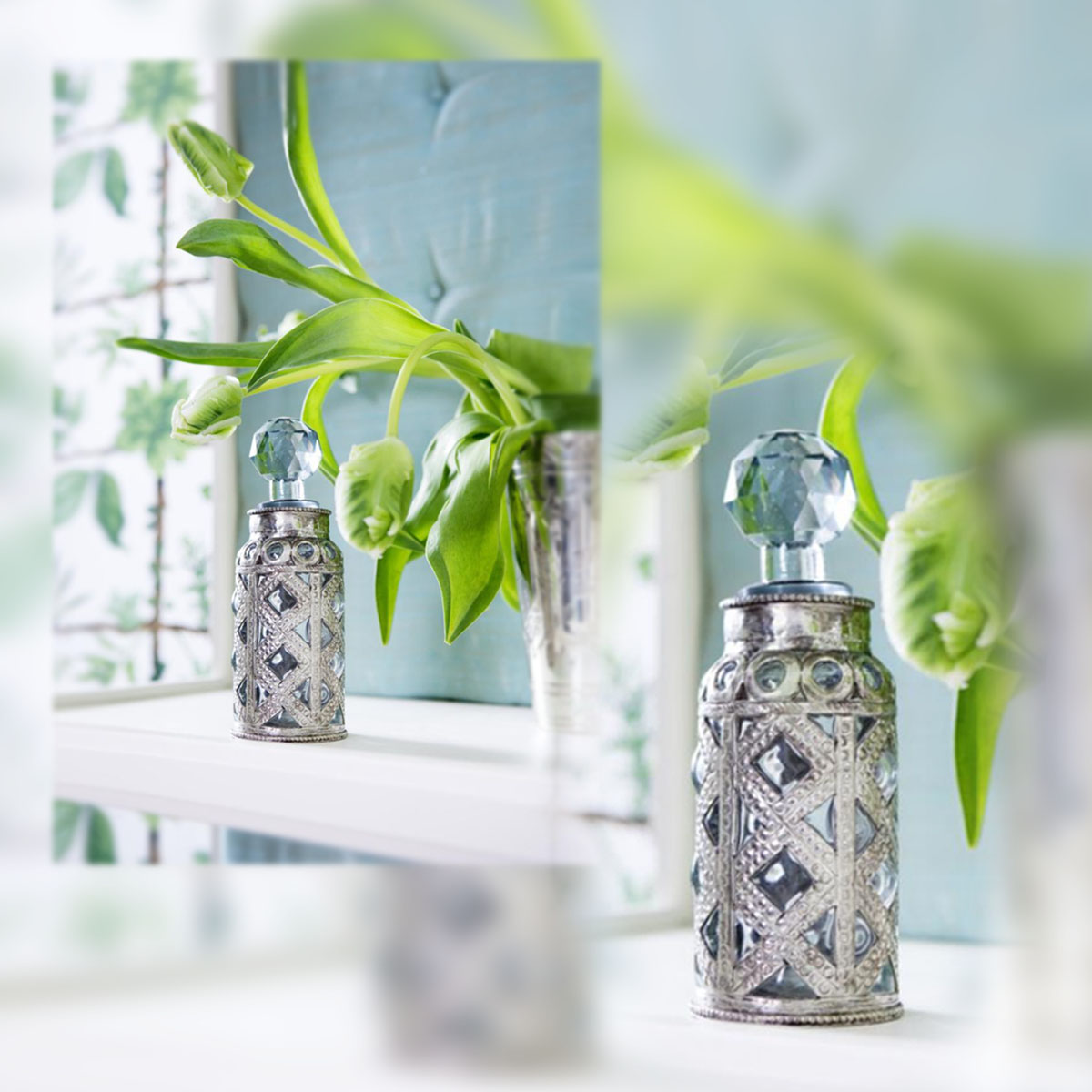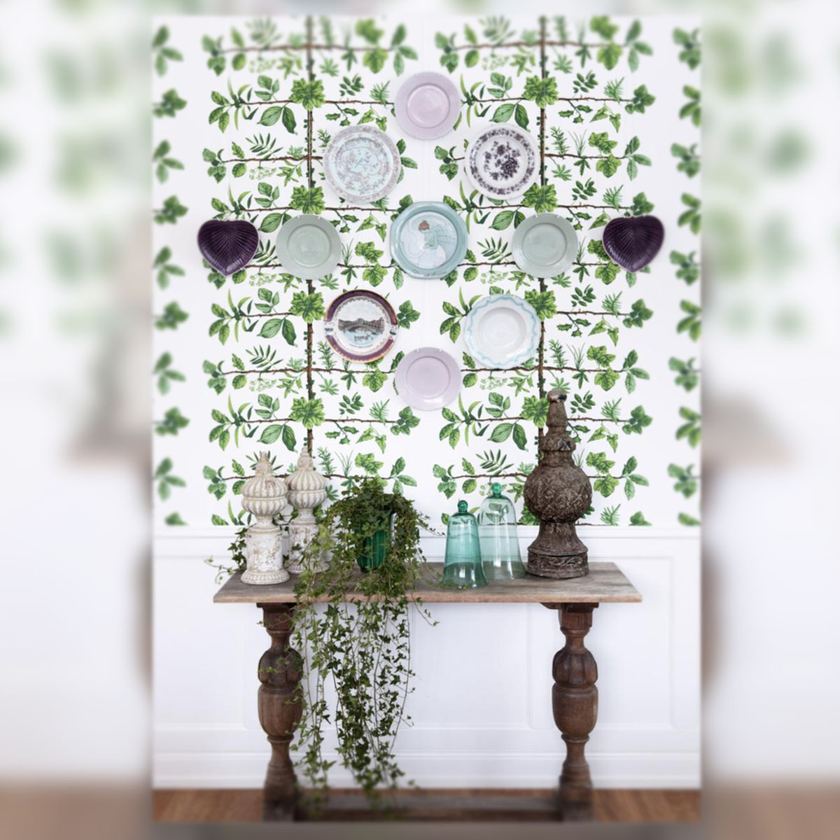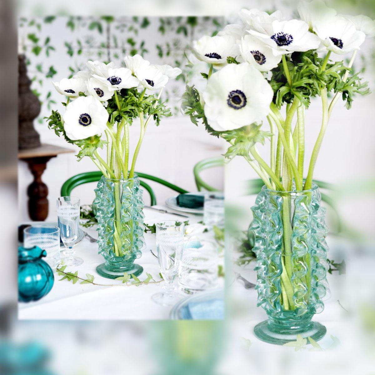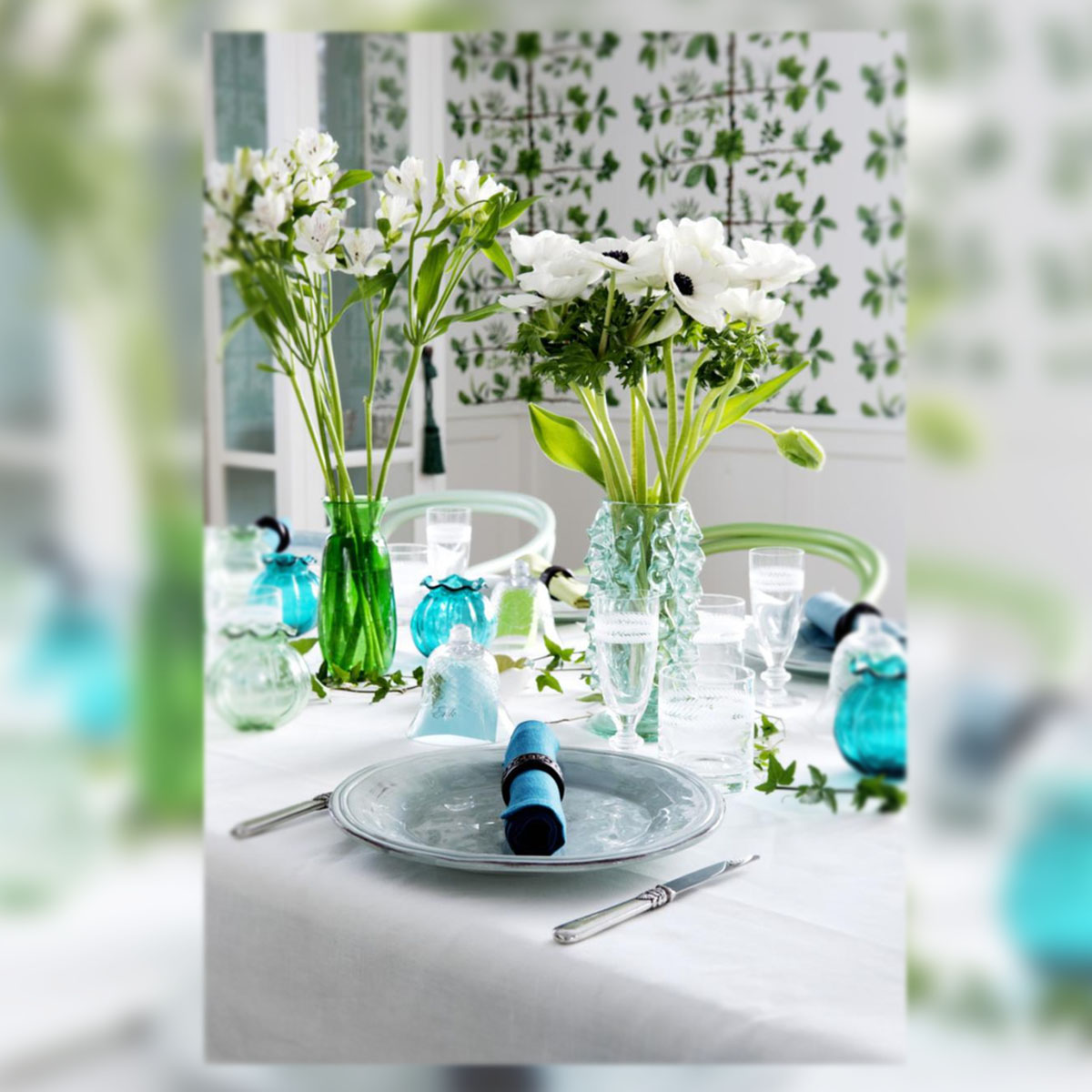En la decoración de nuestras casas también se deja notar su influencia. Para muestra un botón: este magnífico dining room o comedor rodeado de verdes: verde ópalo, verde esmeralda, verde hierba, verde menta… que conjunta con el blanco puro del mobiliario.