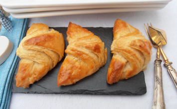 Cortamos triángulos y enrollamos, colocamos los hojaldrillos sobre la bandeja de horno forrado de papel vegetal y dejamos fermentar 10-12 horas en frío.