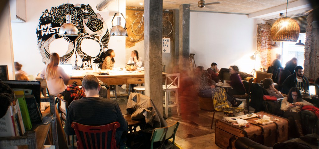 “Todo surgió en Riga, Letonia, durante una conversación en un local vinculado a la bicicleta. Parte era taller y parte café”, cuenta Quique, diseñador gráfico, con la expresión de haber narrado la misma historia unas cuantas veces. No extraña, porque el local tiene personalidad propia y detalles que merecen la pena explicar. Como una pequeña estantería con libros muy usados o una tabla, sobre mesas de madera grandes para compartir, con todo tipo de edulcorantes. “Es por comodidad para el cliente”, responde Tamara, “que disponga de la mayor oferta posible”.