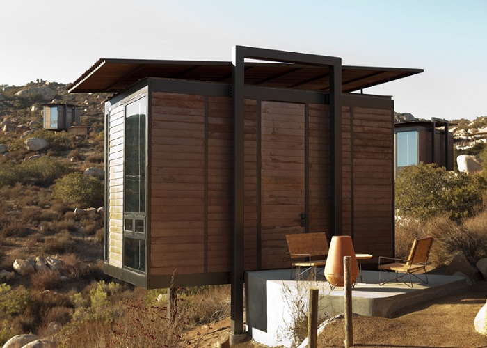 Un volumen rectangular perpendicular a la ladera da forma a cada una de las unidades. Los módulos se elevan del suelo mediante una estructura de acero para no interferir directamente sobre la tierra. Esta solución compone parte de la filosofía del proyecto, que establece como prioridad el respeto al ambiente natural en todas las maneras posibles. De esta forma, tampoco obstaculiza la subsistencia de la vegetación permitiendo la libre circulación de aire y el escurrimiento natural del agua de lluvia.