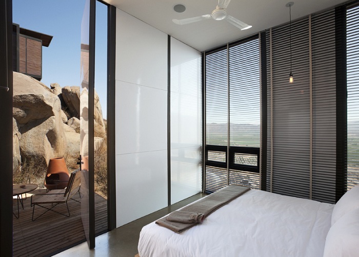Una pequeña terraza de madera ubicada en la parte exterior, sobre uno de sus lados longitudinales, establece el primer contacto con la unidad. Una puerta pivotante ubicada en la parte media del mismo lado permite acceder a la cabaña, compuesta por un dormitorio con baño privado, un pequeño office y una mesa circular para el desayuno. Una transparencia de piso a techo dispuesta en una de las caras transversales permite disfrutar las vistas al paisaje, confiriendo a la habitación abundante luz natural y ventilación.
