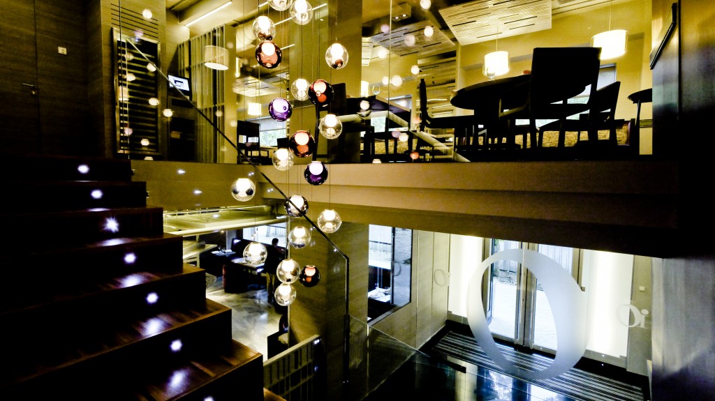 Con una decoración actual que lleva el nombre de Ignacio García de Vinuesa, el restaurante IO tiene tres espacios diferentes, todos luminosos y con cierto aire nórdico por la combinación de maderas. En el recibidor llama la atención la lámpara que ilumina las escaleras que nos conducen al restaurante, muy bien elegida.