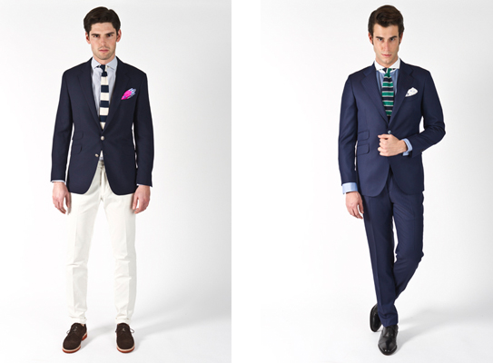Si nos centramos en el clasicismo, este llega a la colección con los trajes y blazers que visten a un hombre sofisticado y elegante pero relajado. Caballeros de alta mar que cuidan los detalles y eligen los complementos perfectos. El azul navy de pantalones y americanas se combina con celeste y blanco en las camisas, corbatas de rayas y pañuelos de cuadro vichy. No faltan los tirantes estampados con escudos, ni los calcetines de rayas marineras.