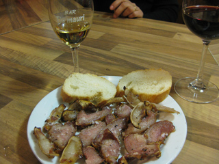 Podéis degustar una gran variedad de pinchos a cual mejor, esas tostadas de queso con confituras, el embuchao, los boletus; el solomillo una delicia, además una gran variedad de vinos, y el servicio maravilloso. Me encantó el pincho de boletus con jamón y las tostadas de queso de cabra con confitura de manzana y nueces toda una delicia para el paladar. Embuchao de cabrito. Donosti, solomillo pimienta mosto vino 3,20€