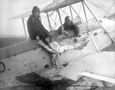 Díaz de Lecea (derecha), miembro del Hyperclub, con una avutarda muerta en el aeródromo de Getafe (1929). / Efe