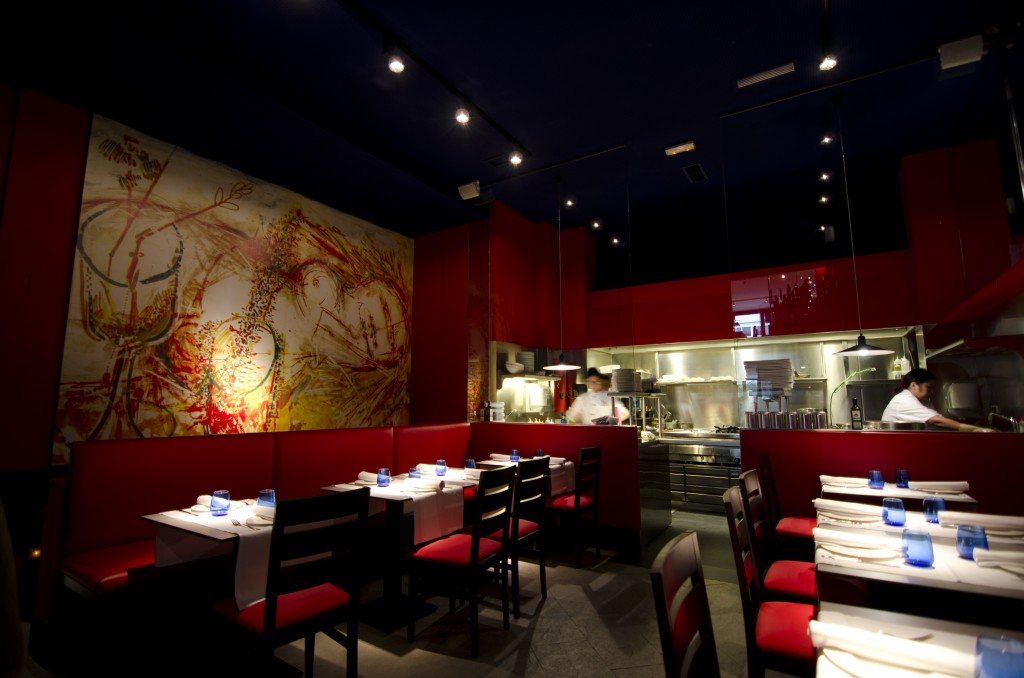 El servicio es eficaz y agradable, el espacio es moderno y nada folclórico, a pesar de vender lo regional. Los rojos de la tapicería eliminan todo aire marinero al local de dos plantas. Un enorme mural en el salón de abajo comparte trazos abstractos, espontáneos, modernos y coloridos con el diseño de las cartas, que parece querer decirnos que la cocina debe ser igual: poco ceremoniosa, de mercado, disfrutona y con origen.