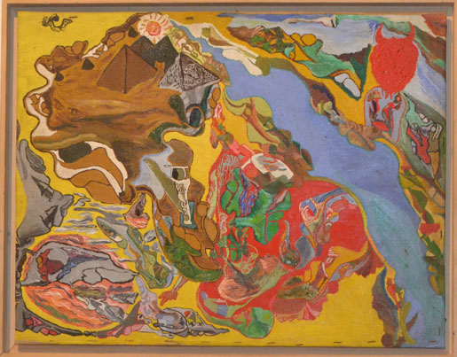 La obra pictórica de Aliounedine es un diario criptográfico, la evolución de un alma en constante construcción. A partir de sus primeras creaciones a lápiz o bolígrafo – cuadernos que por cierto planean viajar en la cápsula del tiempo a su pueblo natal- se puede comprender sus actuales acrílicos sobre lienzo o madera. Cada una de sus ilustraciones cuentan una historia, como un cómic que nada de cómico tiene y con un estilo que nos recuerda a Escher – deconstruye el espacio para conseguir nuevas dimensiones, espacios paradójicos que desafían lo establecido y engañan al ojo- con cierta reminiscencia de los pintores españoles de los 80 y un aire daliniano inverso donde el subconsciente puede ablandarse ambientalmente en ensoñaciones o lanzarse de cabeza en perspectivas exageradas, pero se trata de un falso subconsciente porque no sólo es consciente sino que aspira a despertar conciencias. Justo sobrepasa el sueño o la pesadilla para reflejar crudas realidades aprovechando la estética del subconsciente. Sus obras son interactivas, por un lado jugando con la ilustración que gira sobre si misma para terminar de desarrollar la historia, es decir según como se mire el cuadro encontraremos diferentes rostros, diferentes sentimientos, realidades o historias relacionadas; pero el juego se duplica al interactuar con el observador que gira el cuadro a su antojo desde su particular calidoscopio multiplicando las posibilidades hasta el infinito, por no subestimar las capacidades imaginativas del hombre.