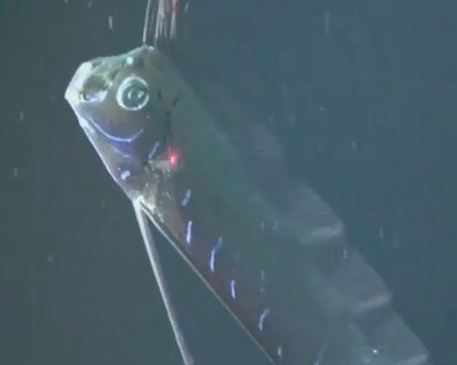 En estos dos vídeos se pueden ver dos de las cinco grabaciones, realizadas por biólogos de la Universidad de Louisiana, del pez remo (Regalecus glesne).