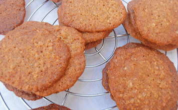 Hervimos en un cazo la mantequilla, el azúcar, la miel, la leche y la sal. Mientras tanto mezclamos la harina con la levadura y los copos de avena y lo añadimos a lo anterior removemos y dejamos enfriar.