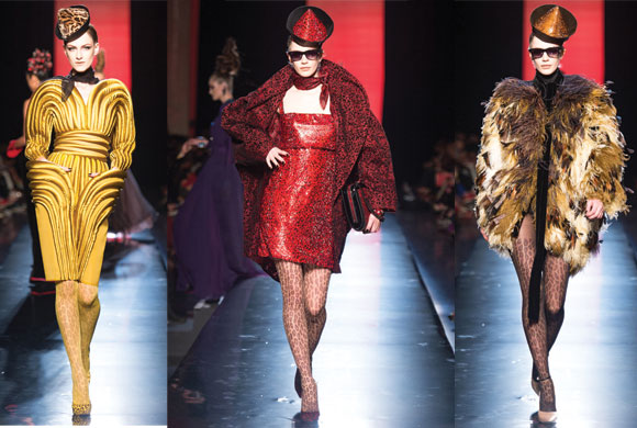 La pasarela fue tomada por felinas de la mano de Jean Paul Gaultier. El francés se inspira en la película de Federico Fellini, » La pantera rosa», para desplegar su creatividad entre fieros prints, plumas y su obsesión por los corsés y los volúmenes de Klaus Nomi. Acompañados de detalles conoideos en tocados y en ciertas piezas añadiendo un toque más a la teatralidad que tanto gusta al diseñador.