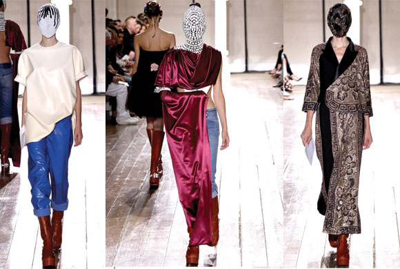 Si hablamos de romper esquemas y de transformaciones, hablamos de Maison Martin Margiela. Nadie como ellos para dejarte boquiabierto, nadie sino ellos para subir a la alta costura jeans vintage. Enfundados en máscaras inspiradas en diferentes formas de arte, haciendo uso del vinilo en pantalones y transformando ropa vieja en nueva a través de un abanico de materiales y un trabajo artesanal meticuloso, la firma dio una lección de creatividad mediante un ejercicio de moda insólito.