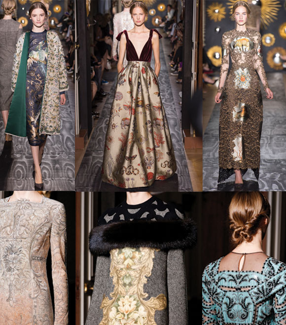 Nuevamente Maria Grazia Chiuri y Pierpaolo Piccioli, el dúo que está detras de Valentino, lograron presentar una colección prodigiosa. Ellos pretenden no solo hacer algo especial sino inesperado y presentar prendas que no solo se puedan llevar en ocasiones especiales sino también de día, como abrigos de espigas y ligeras capas, sin dejar de ser sublimes. Consiguen sorprender en cada salida con piezas de una calidad artesanal exquisita, arte puro, como en lo que se inspiran. La pintura de van Dyck, los grabados de Jacobo Ligozzi, la obra de de la segunda mitad del siglo XV de Pedro Berruguete… tienen representación en la colección y se componen con maestría en vestidos y faldas. La abundancia de materiales utilizados parece ilimitada y los bordados con perlas de algunos vestidos son el artífice del resultado de una costura espectacular.