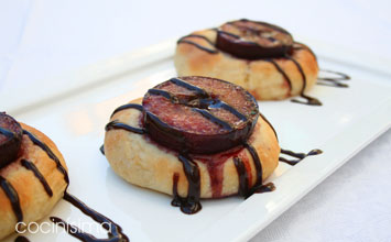 Cuando la masa haya aumentado, colocamos la mitad de una ciruela encima de cada disco, rociamos con el jugo de la fuente y horneamos a 190º durante 15 minutos, hasta que la base se dore.