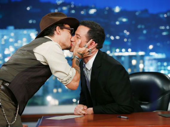 Depp acudió al show para promocionar su reciente película, The Lone Ranger, en donde Kimmel resaltó la belleza del actor. “Tú sabes, eres muy guapo, este… seré honesto y diré que tienes un bello rostro”, le dijo el conductor. Como respuesta, Johnny le dio dos sonoros besos al presentador.