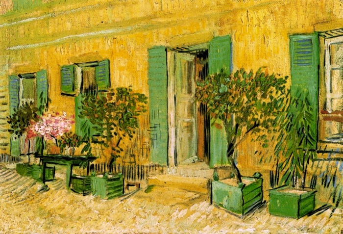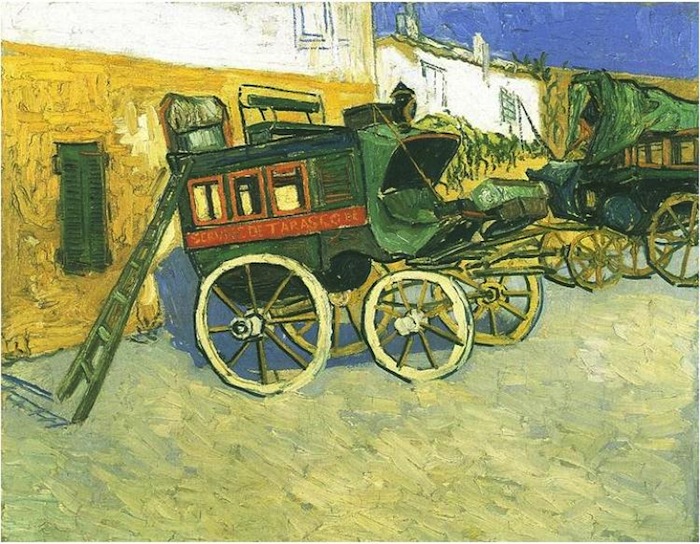 Esto, para tomarme el desquite del reposo forzado a que me he visto obligado. Trabajaré aún todo el día de mañana; pero ya ves qué simple es la concepción. Las sombras y las sombras proyectadas están suprimidas; ha sido coloreado con tintes planos y francos como los crespones. Esto va a contrastar con, por ejemplo, La diligencia de Tarascón y el Café nocturno.