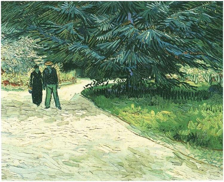 He aquí un croquis muy vago de mi última tela; una fila de cipreses verdes contra un cielo rosa, con un cuarto creciente limón pálido. En primer plano, un terreno yermo, arena y algunos cardos. Dos enamorados; el hombre, azul pálido y sombrero amarillo; la mujer, con un corpiño rosa y una falda negra. Esta, hace la cuarta tela del Jardín del poeta, que es la descoronación del cuarto de Gauguin. Me causa horror tener todavía que pedirte dinero, pero no puedo hacer nada y aun así sigo todavía abrumado. Sin embargo, creo que el trabajo que hago gastando un poco más, nos parecerá un día más barato que el anterior.