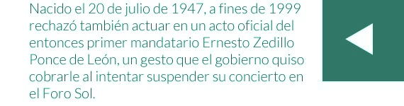 Nunca dejó de creer en Dios y en Los Ángeles. Nunca dejó de ser un hippie defensor de los postulados sesentistas y, tal como ha declarado en varias entrevistas, nunca dejó de ser “un verdadero mexicano que siempre he llevado con honor y por lo alto el nombre de mi país”.