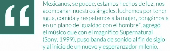 En la plenitud sentimental, leal a su misticismo “ecléctico” como él mismo llama a ese conjunto de ideas que lo hace proclamarse ateo pero devoto de la virgen de Guadalupe y ahora pastor cristiano, apartidario pero siempre cercano a las causas sociales y atento a las necesidades de los más pobres, Carlos Santana es uno de los artistas más grandes de México. Ha vendido más de 100 millones de álbumes y es miembro de El Salón de la Fama del Rock and Roll. Ha sido acreedor a 10 premios Grammy.
